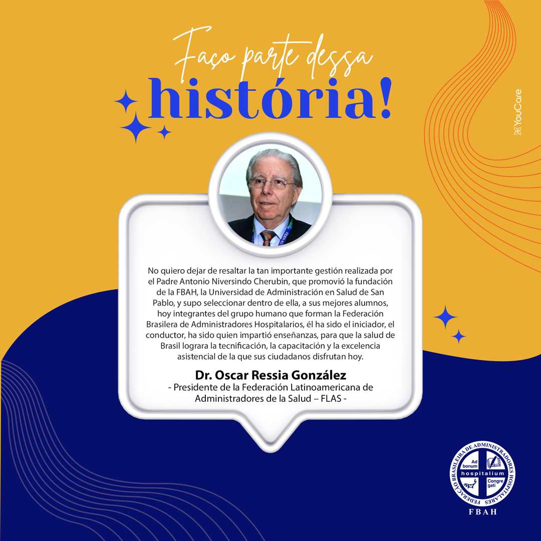 No quiero dejar de resaltar la tan importante gestión realizada por el Padre Antonio Niversindo Cherubin, que promovió la fundación de la FBAH, la Universidad de Administración en Salud de San Pablo, y supo seleccionar dentro de ella, a sus mejores alumnos, hoy integrantes del grupo humano que forman la Federación Brasilera de Administradores Hospitalarios, él ha sido el iniciador, el conductor, ha sido quien impartió enseñanzas, para que la salud de Brasil lograra la tecnificación, la capacitación y la excelencia asistencial de la que sus ciudadanos disfrutan hoy.