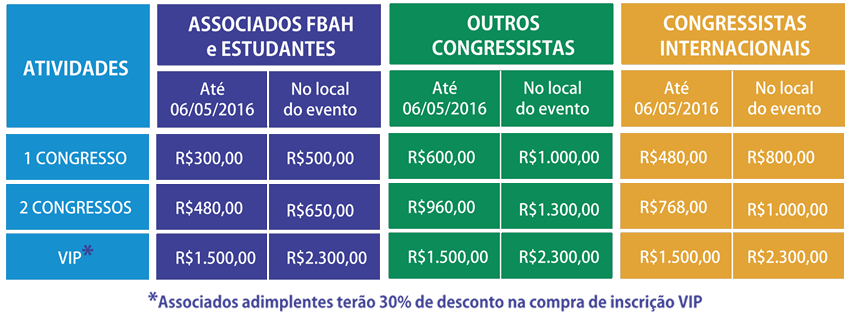 1. A FBAH praticará a tabela acima para as inscrições dos congressos.